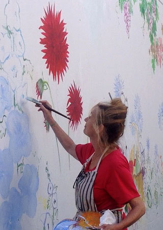 In the Fall of 2017 and Spring of 2018, Brooklyn-based artist Sally Mary Sturman and her colleague Catherine Guillaud, an artist and filmmaker based in Biarritz - France, created a garden mural on what were previously two barren concrete adjoining walls outside the gardens at the Helen & Harry Gray Cancer Center at Hartford Hospital. This project was initiated by Mary Lowengard.